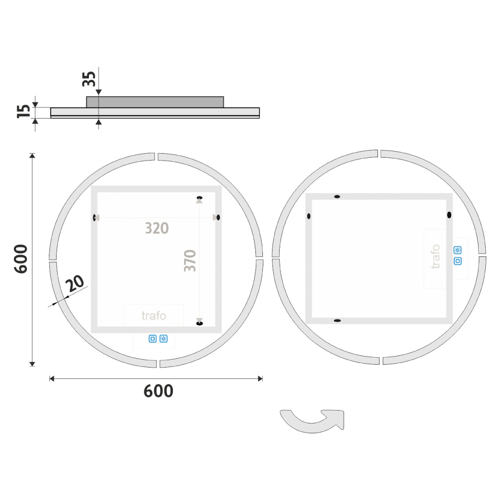 Ovládání: Dotykové senzory + možnost ovládání nástěnným vypínačem Nastavení barvy podsvícení: Ano Barva podsvícení: Nastavitelná v rozsahu 3000–6500 K (od teplé po studenou bílou) Funkce stmívání: Plynulé stmívání Paměť nastavení: Ano Konstrukce podsvícení: K rovnoměrnému rozptylu světla zrcadlo disponuje difuzorem z akrylového skla Integrace LED: LED diody jsou integrovány přímo v difuzoru LED čip: Nejmodernější LED čipy SMD 2835 LED pásek - hustota čipů: 192/m (96+96/m) Životnost LED čipů: Až 50 000 hodin Kvalita osvětlení LED: Survival Factor = 1; Lumen maintenance factor = 0,99; Flicker metric = 0,02 Materiál: Zrcadlové sklo, hliník Materiál konstrukce: Rám zrcadla a kryt zdroje jsou vyrobeny z hliníku Tloušťka skla: 5 mm Ochrana při rozbití: Bezpečnostní fólie Stupeň ochrany: IP 44 Certifikace: Český certifikát CE Umístění: Montáž na stěnu Možnost upevnění vertikálně i horizontálně Montážní příslušenství: Součástí balení je montážní sada a kabelová spojka s ochranou IP 44 Obal: Zabalené pro přepravu kurýrní službou Napětí: Vstupní napětí 220-240 V Výstupní napětí 12 V Příkon: 28 W, světelný tok: 2016 lm Rozměr: v: 600 mm š: 37 mm d: 600 mm Hmotnost: 5,66 kg M A T E R I Á L & F U N K Č N Í P A R A M E T R Y