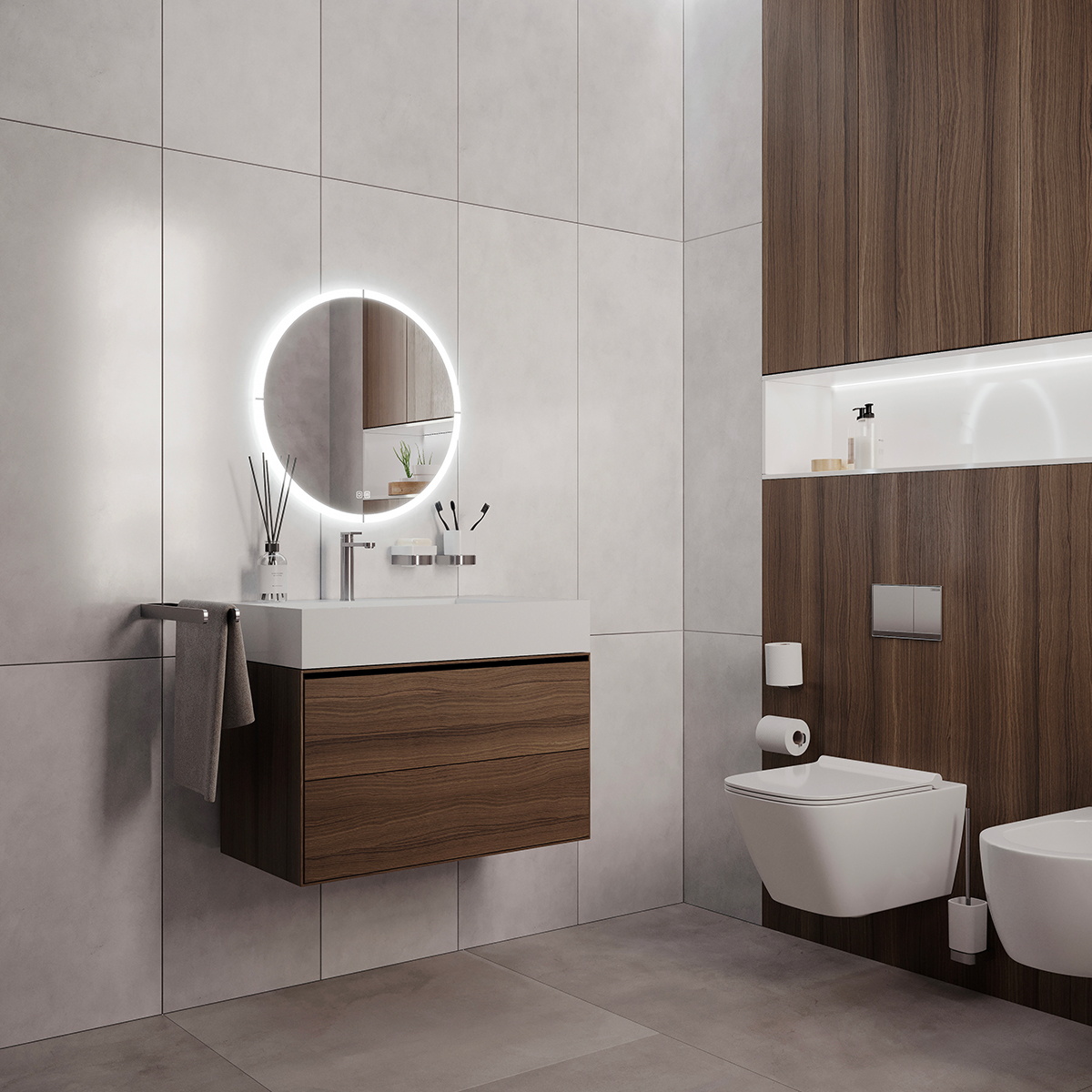 Kulaté bezrámové zrcadlo a s celoobvodovým podsvícením pro dokonalé a rovnoměrné osvětlení.