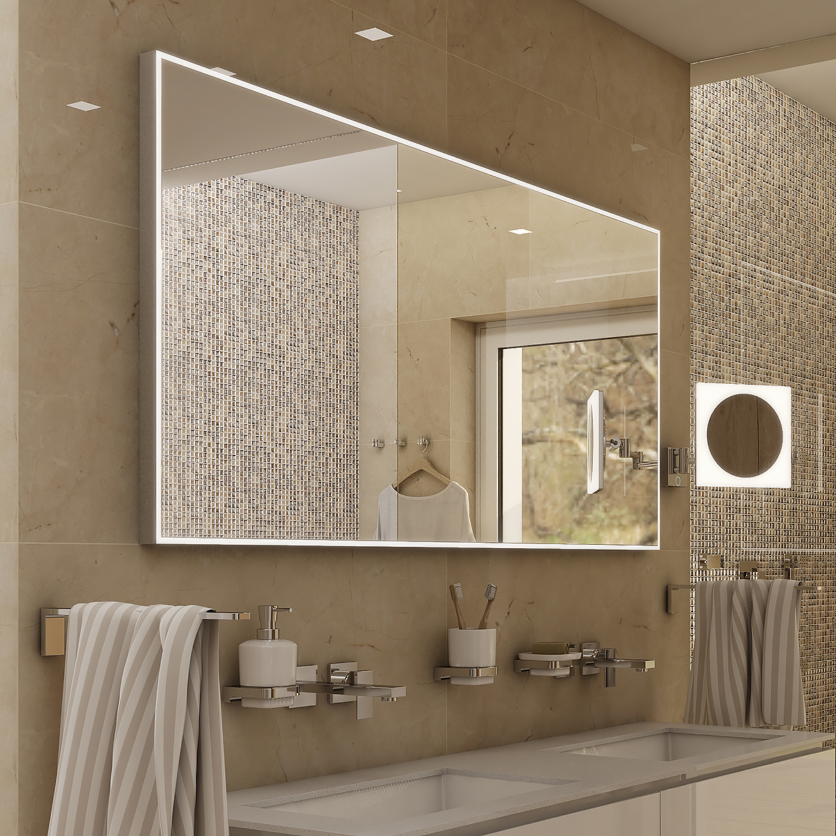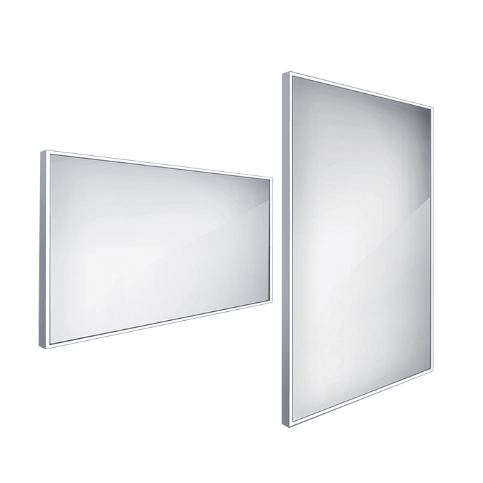 Obdélníkové zrcadlo s rámem s ostrými rohy a celoobvodovým svícením pro dokonalé a rovnoměrné osvětlení.