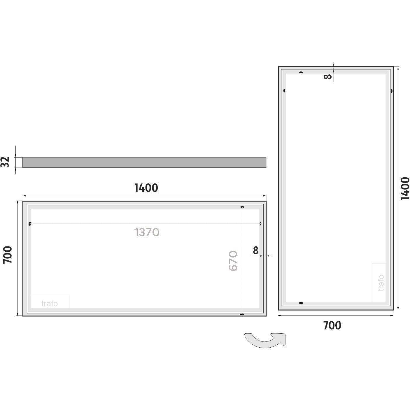 - Materiál konstrukce: Rám zrcadla a kryt zdroje jsou vyrobeny z hliníku