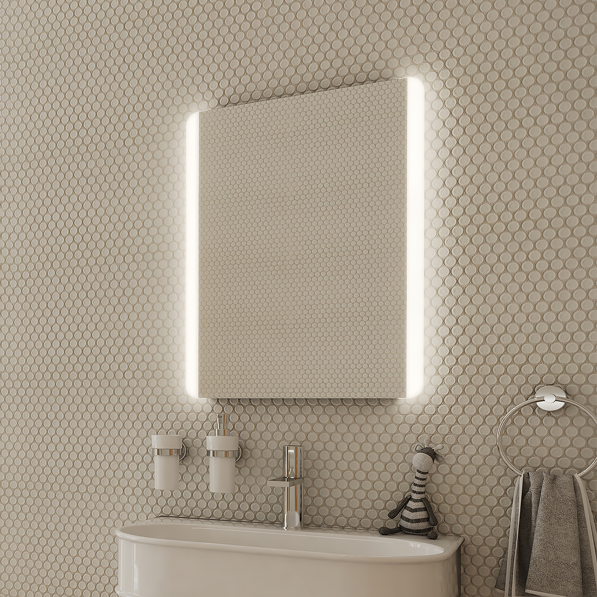 Obdélníkové bezrámové zrcadlo s oblými rohy a podsvícením ze stran pro moderní a elegantní vzhled.