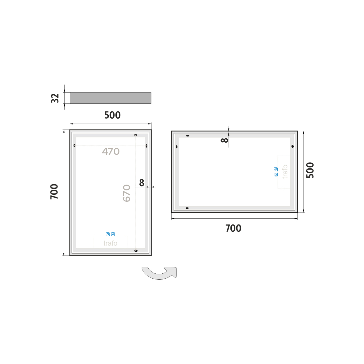 Ovládání: Dotykové senzory + možnost ovládání nástěnným vypínačem Nastavení barvy světla: Ano Barva světla: Nastavitelná v rozsahu 3000–6500 K (od teplé po studenou bílou) Funkce stmívání: Plynulé stmívání Paměť nastavení: Automatická paměť nastavení Konstrukce svícení: K rovnoměrnému rozptylu světla zrcadlo disponuje akrylovým matovaným difuzorem Integrace LED: Led diody jsou zabudované v rámu LED čip: Nejmodernější LED čipy SMD 2835 LED pásek - hustota čipů: 192/m (96+96/m) Životnost LED čipů: Až 50 000 hodin Kvalita osvětlení LED: Survival Factor = 1; Lumen maintenance factor = 0,99; Flicker metric = 0,02 Materiál: Zrcadlové sklo, hliník Materiál konstrukce: Rám zrcadla a kryt zdroje jsou vyrobeny z hliníku Tloušťka skla: 5 mm Ochrana při rozbití: Bezpečnostní fólie Stupeň ochrany: IP 44 Certifikace: Český certifikát CE Umístění: Montáž na stěnu Možnost upevnění vertikálně i horizontálně Montážní příslušenství: Součástí balení je montážní sada a kabelová spojka s ochranou IP 44 Obal: Zabalené pro přepravu kurýrní službou Napětí: Vstupní napětí 220-240 V Výstupní napětí 12 V Příkon: 35 W, světelný tok: 2520 lm Rozměr: v: 700 mm š: 37 mm d: 500 mm Hmotnost: 6,28 kg M A T E R I Á L & F U N K Č N Í P A R A M E T R Y