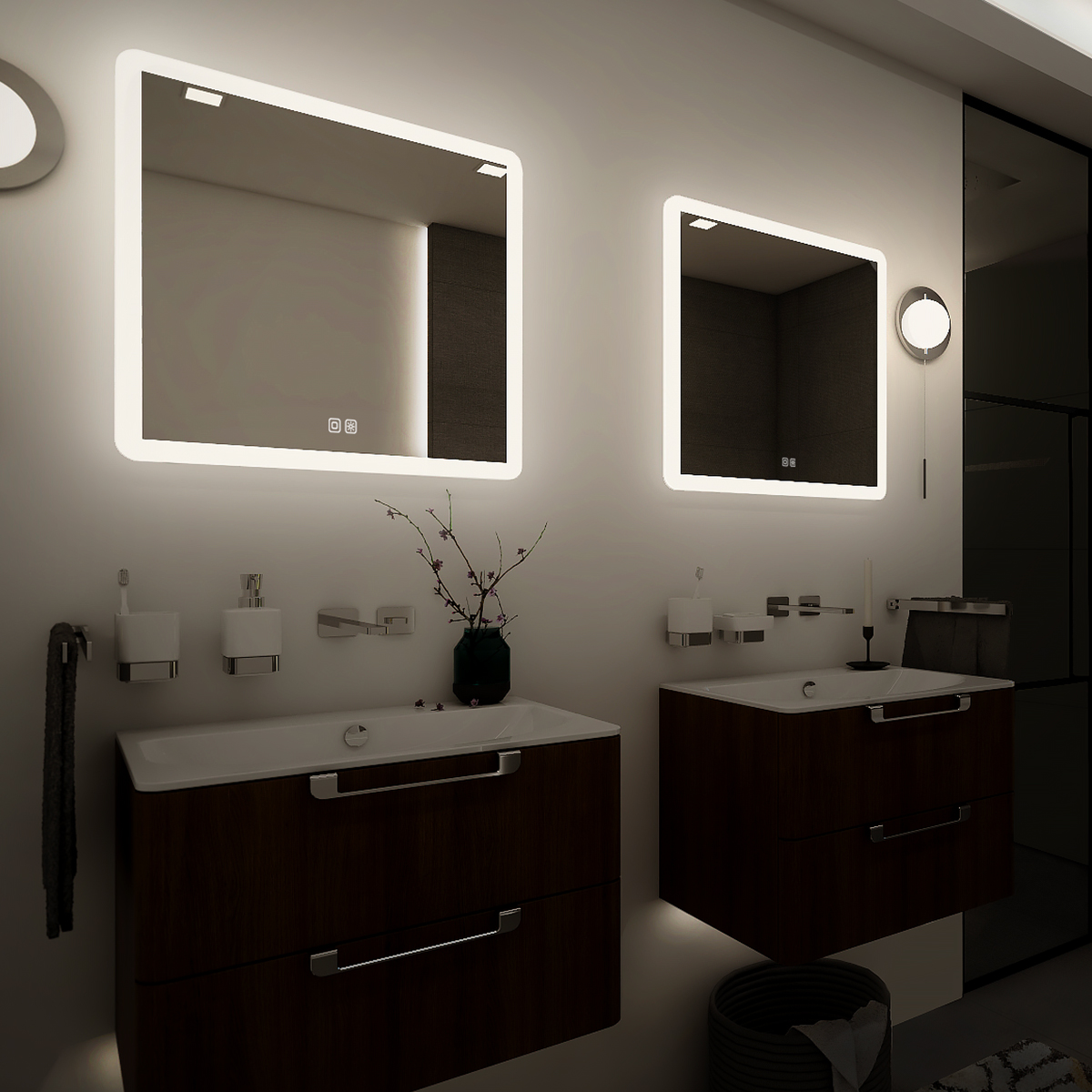 Čtvercové bezrámové zrcadlo s oblými rohy a celoobvodovým podsvícením pro dokonalé a rovnoměrné osvětlení.