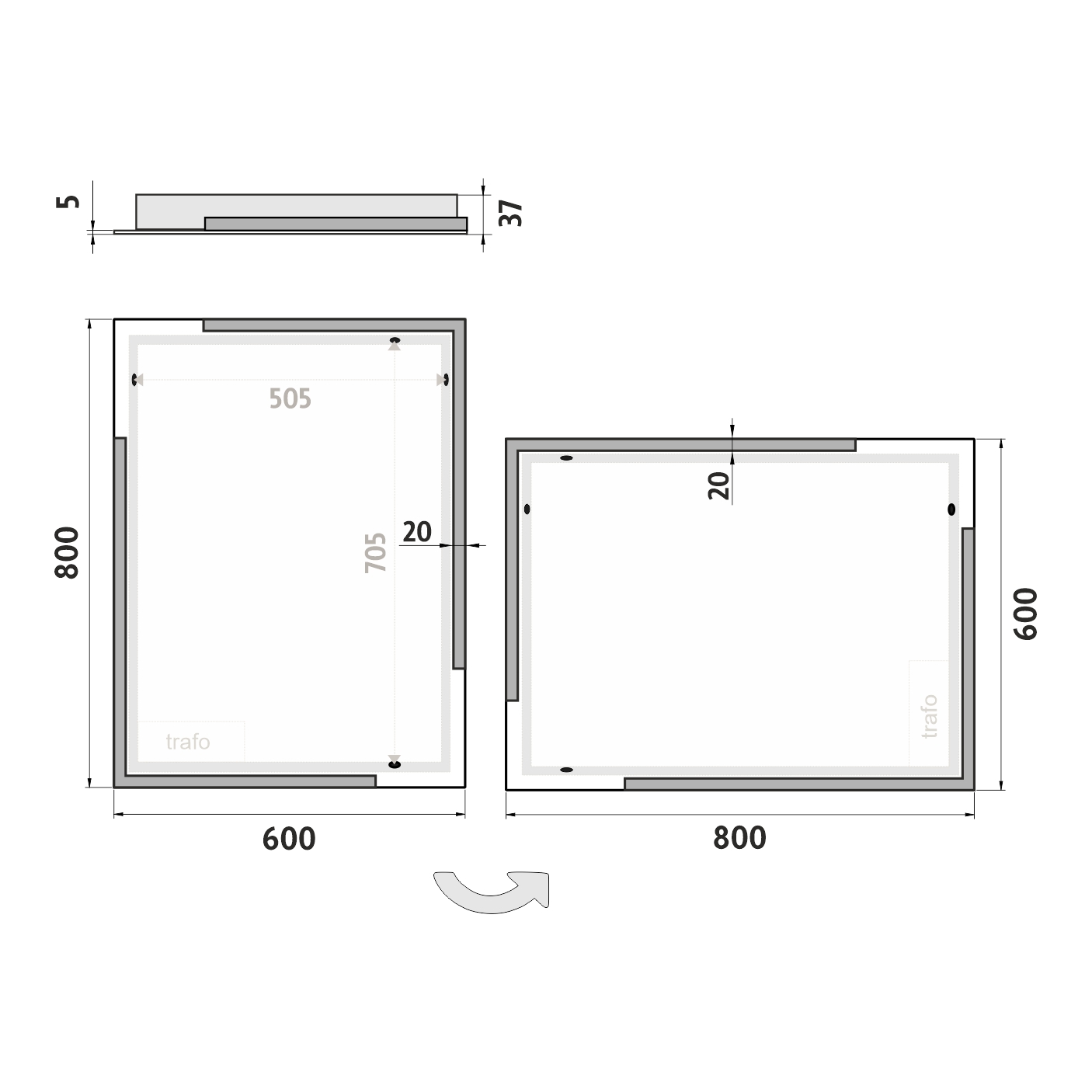 - Konstrukce podsvícení: K rovnoměrnému rozptylu světla zrcadlo disponuje difuzorem z akrylového skla