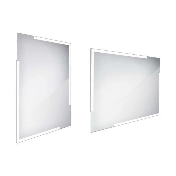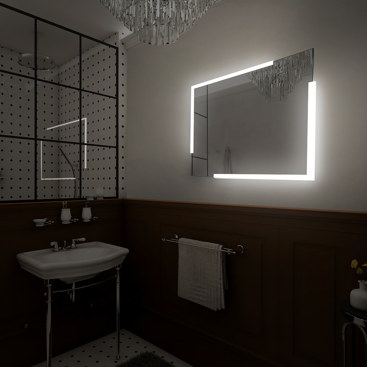 Obdélníkové bezrámové zrcadlo s ostrými rohy a celoobvodovým podsvícením pro dokonalé a rovnoměrné osvětlení.