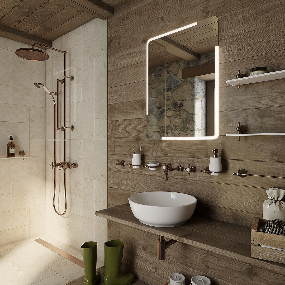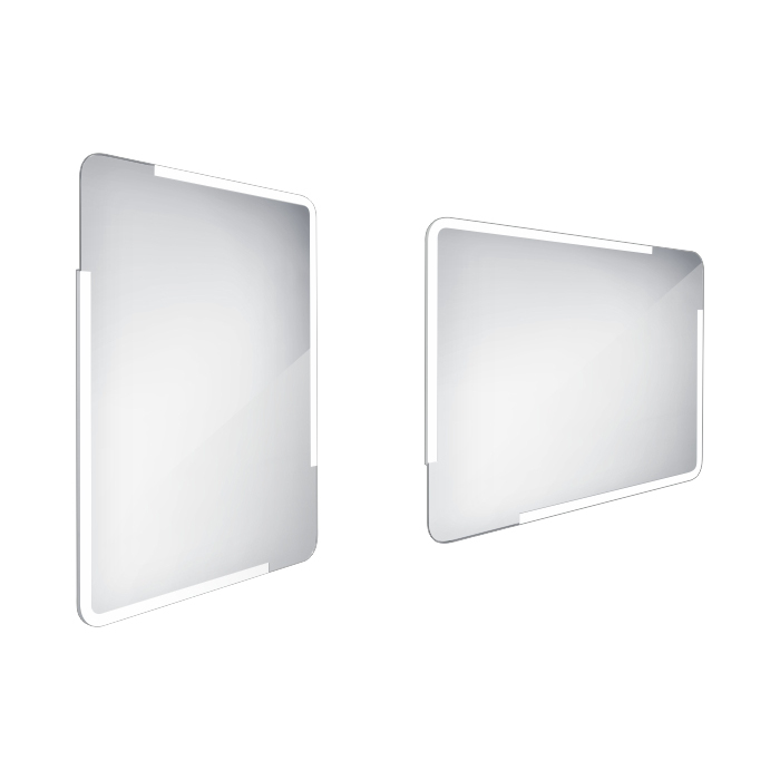 Obdélníkové bezrámové zrcadlo s oblými rohy a celoobvodovým podsvícením pro dokonalé a rovnoměrné osvětlení.