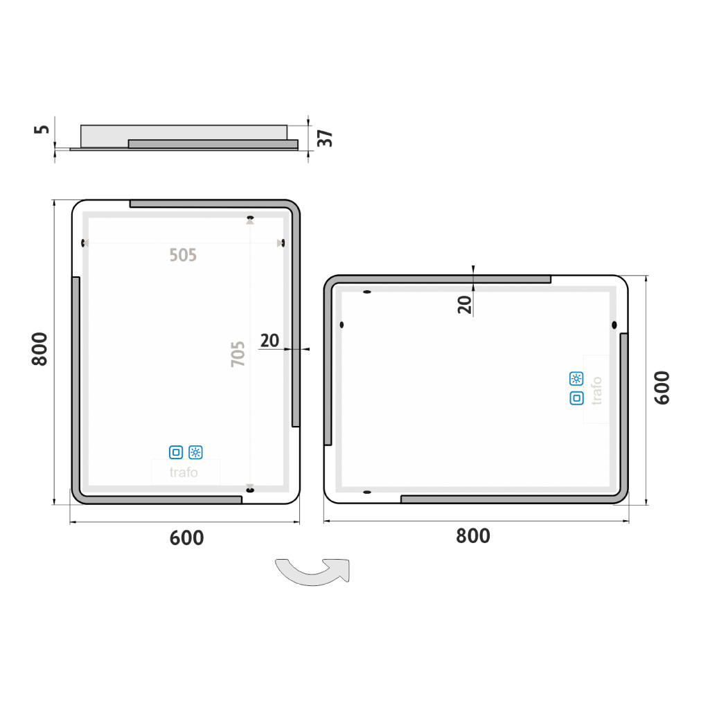 Ovládání: Dotykové senzory + možnost ovládání nástěnným vypínačem Nastavení barvy podsvícení: Ano Barva podsvícení: Nastavitelná v rozsahu 3000–6500 K (od teplé po studenou bílou) Funkce stmívání: Plynulé stmívání Paměť nastavení: Ano Konstrukce podsvícení: K rovnoměrnému rozptylu světla zrcadlo disponuje difuzorem z akrylového skla Integrace LED: LED diody jsou integrovány přímo v difuzoru LED čip: Nejmodernější LED čipy SMD 2835 LED pásek - hustota čipů: 192/m (96+96/m) Životnost LED čipů: Až 50 000 hodin Kvalita osvětlení LED: Survival Factor = 1; Lumen maintenance factor = 0,99; Flicker metric = 0,02 Materiál: Zrcadlové sklo, hliník Materiál konstrukce: Rám zrcadla a kryt zdroje jsou vyrobeny z hliníku Tloušťka skla: 5 mm Ochrana při rozbití: Bezpečnostní fólie Stupeň ochrany: IP 44 Certifikace: Český certifikát CE Umístění: Montáž na stěnu Možnost upevnění vertikálně i horizontálně Montážní příslušenství: Součástí balení je montážní sada a kabelová spojka s ochranou IP 44 Obal: Zabalené pro přepravu kurýrní službou Napětí: Vstupní napětí 220-240 V Výstupní napětí 12 V Příkon: 32 W, světelný tok: 2304 lm Rozměr: v: 800 mm š: 37 mm d: 600 mm Hmotnost: 8,96 kg M A T E R I Á L & F U N K Č N Í P A R A M E T R Y