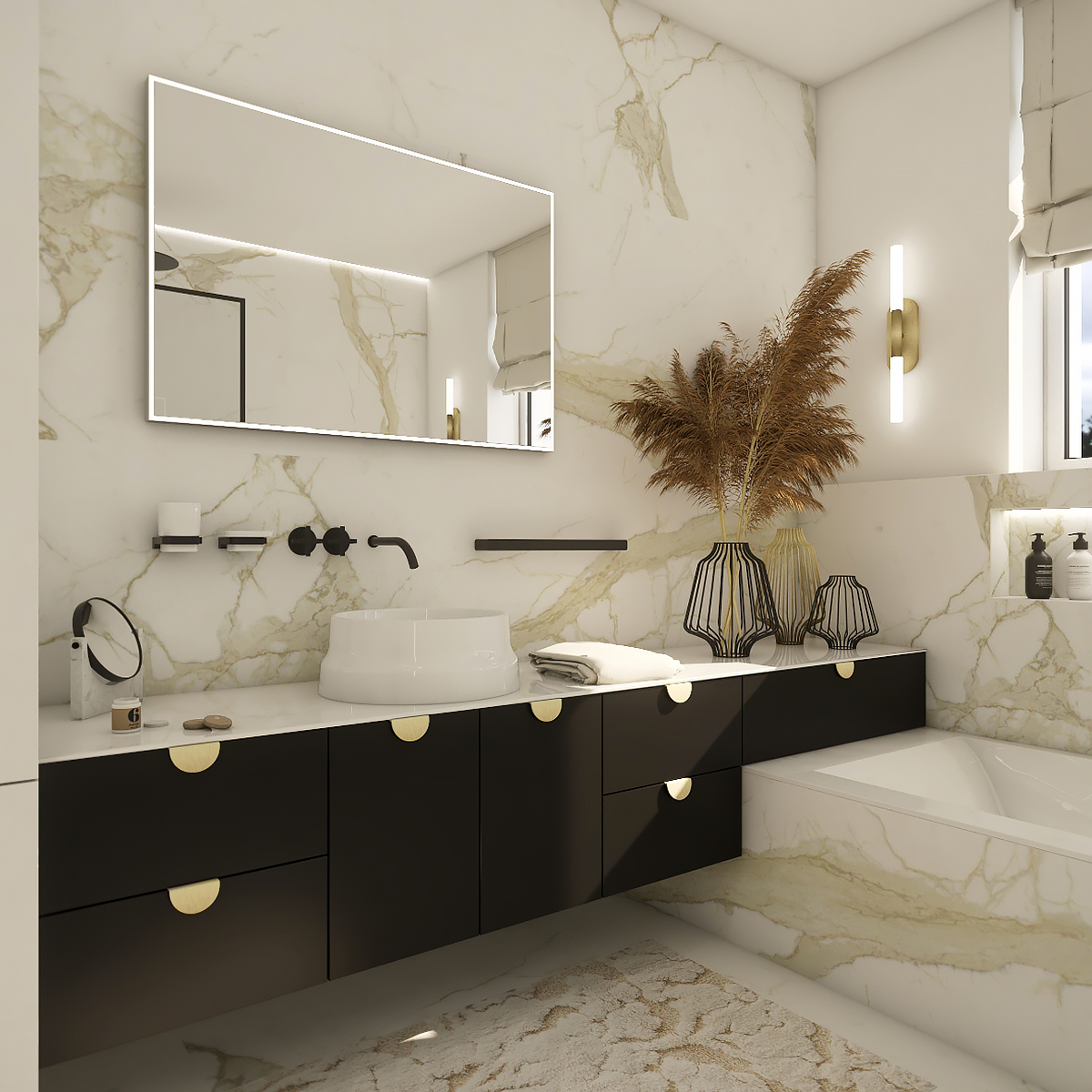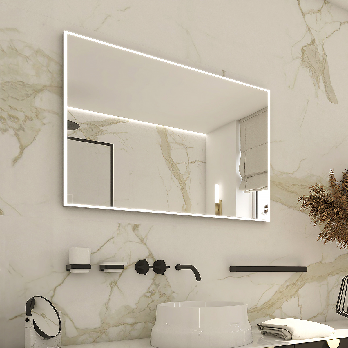 Obdélníkové zrcadlo s rámem s ostrými rohy a celoobvodovým svícením pro dokonalé a rovnoměrné osvětlení.