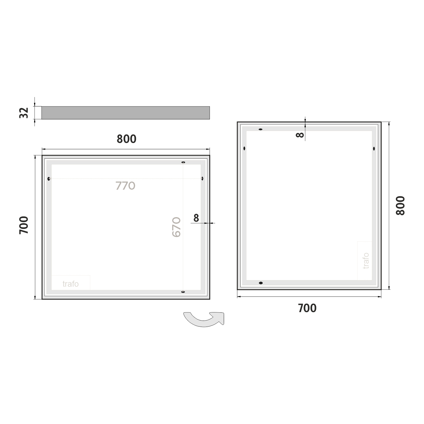 Nosná konstrukce zrcadla je vyrobena z masivního hliníkového rámu o rozměrech 32x19 mm, který zajišťuje vysokou pevnost a stabilitu. Stejně tak je z hliníku vyroben kryt zdroje a všech elektronických součástek. Sklo o tloušťce 5 mm je opatřeno bezpečnostní fólií, která chrání před zraněním v případě rozbití. Zrcadlo navíc disponuje stupněm ochrany proti vlhkosti IP44, což zaručuje spolehlivost i v prostředí s vyšší vlhkostí.