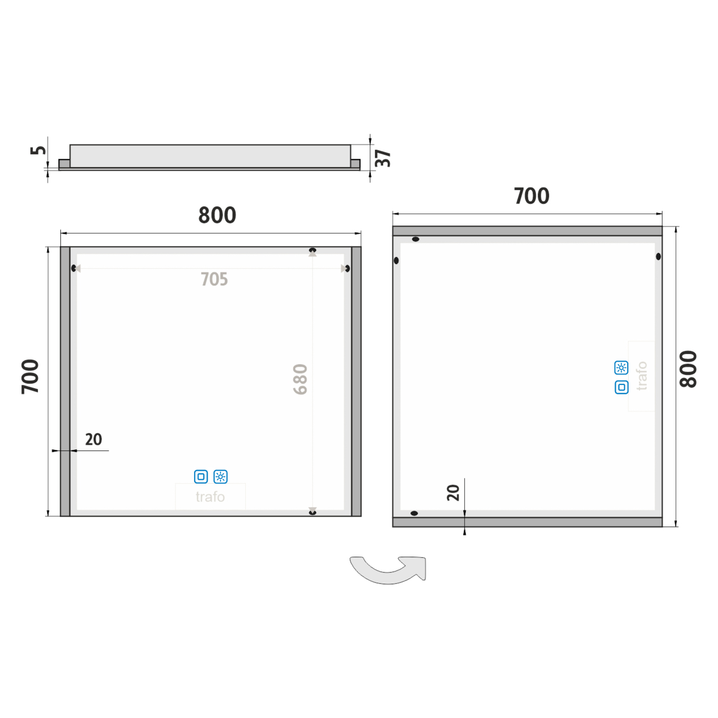 Ovládání: Dotykové senzory + možnost ovládání nástěnným vypínačem Nastavení barvy podsvícení: Ano Barva podsvícení: Nastavitelná v rozsahu 3000–6500 K (od teplé po studenou bílou) Funkce stmívání: Plynulé stmívání Paměť nastavení: Ano Konstrukce podsvícení: K rovnoměrnému rozptylu světla zrcadlo disponuje difuzorem z akrylového skla Integrace LED: LED diody jsou integrovány přímo v difuzoru LED čip: Nejmodernější LED čipy SMD 2835 LED pásek - hustota čipů: 192/m (96+96/m) Životnost LED čipů: Až 50 000 hodin Kvalita osvětlení LED: Survival Factor = 1; Lumen maintenance factor = 0,99; Flicker metric = 0,02 Materiál: Zrcadlové sklo, hliník Materiál konstrukce: Rám zrcadla a kryt zdroje jsou vyrobeny z hliníku Tloušťka skla: 5 mm Ochrana při rozbití: Bezpečnostní fólie Stupeň ochrany: IP 44 Certifikace: Český certifikát CE Umístění: Montáž na stěnu Možnost upevnění vertikálně i horizontálně Montážní příslušenství: Součástí balení je montážní sada a kabelová spojka s ochranou IP 44 Obal: Zabalené pro přepravu kurýrní službou Napětí: Vstupní napětí 220-240 V Výstupní napětí 12 V Příkon: 21 W, světelný tok: 1512 lm Rozměr: v: 700 mm š: 37 mm d: 800 mm Hmotnost: 9,74 kg M A T E R I Á L & F U N K Č N Í P A R A M E T R Y