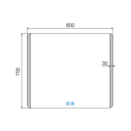 Obdélníkové bezrámové zrcadlo s oblými rohy a podsvícením ze stran pro moderní a elegantní vzhled.