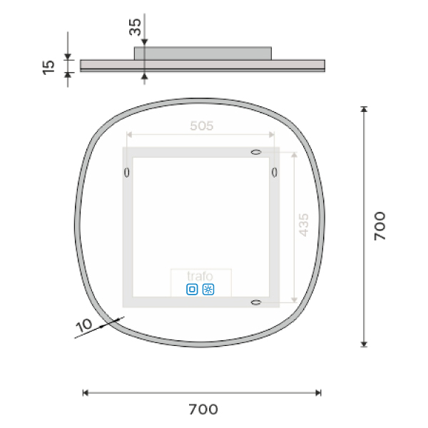 Ovládání: Dotykové senzory + možnost ovládání nástěnným vypínačem Nastavení barvy podsvícení: Ano Barva podsvícení: Nastavitelná v rozsahu 3000–6500 K (od teplé po studenou bílou) Funkce stmívání: Plynulé stmívání Paměť nastavení: Ano Konstrukce podsvícení: K rovnoměrnému rozptylu světla zrcadlo disponuje difuzorem z akrylového skla Integrace LED: LED diody jsou integrovány přímo v difuzoru LED čip: Nejmodernější LED čipy SMD 2835 LED pásek - hustota čipů: 192/m (96+96/m) Životnost LED čipů: Až 50 000 hodin Kvalita osvětlení LED: Survival Factor = 1; Lumen maintenance factor = 0,99; Flicker metric = 0,02 Materiál: Zrcadlové sklo, hliník Materiál konstrukce: Rám zrcadla a kryt zdroje jsou vyrobeny z hliníku Tloušťka skla: 5 mm Ochrana při rozbití: Bezpečnostní fólie Stupeň ochrany: IP 44 Certifikace: Český certifikát CE Umístění: Montáž na stěnu Možnost upevnění vertikálně i horizontálně Montážní příslušenství: Součástí balení je montážní sada a kabelová spojka s ochranou IP 44 Obal: Zabalené pro přepravu kurýrní službou Napětí: Vstupní napětí 220-240 V Výstupní napětí 12 V Příkon: 28 W, světelný tok: 2016 lm Rozměr: v: 700 mm š: 35 mm d: 700 mm Hmotnost: 7,72 kg M A T E R I Á L & F U N K Č N Í P A R A M E T R Y