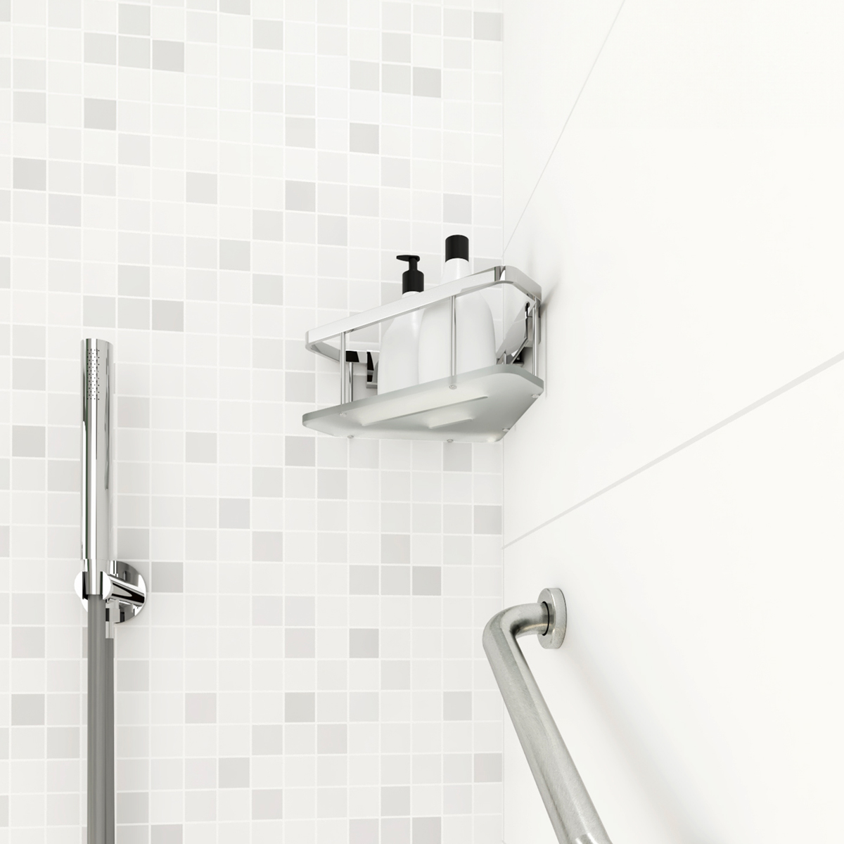 Corner bathroom and shower shelf