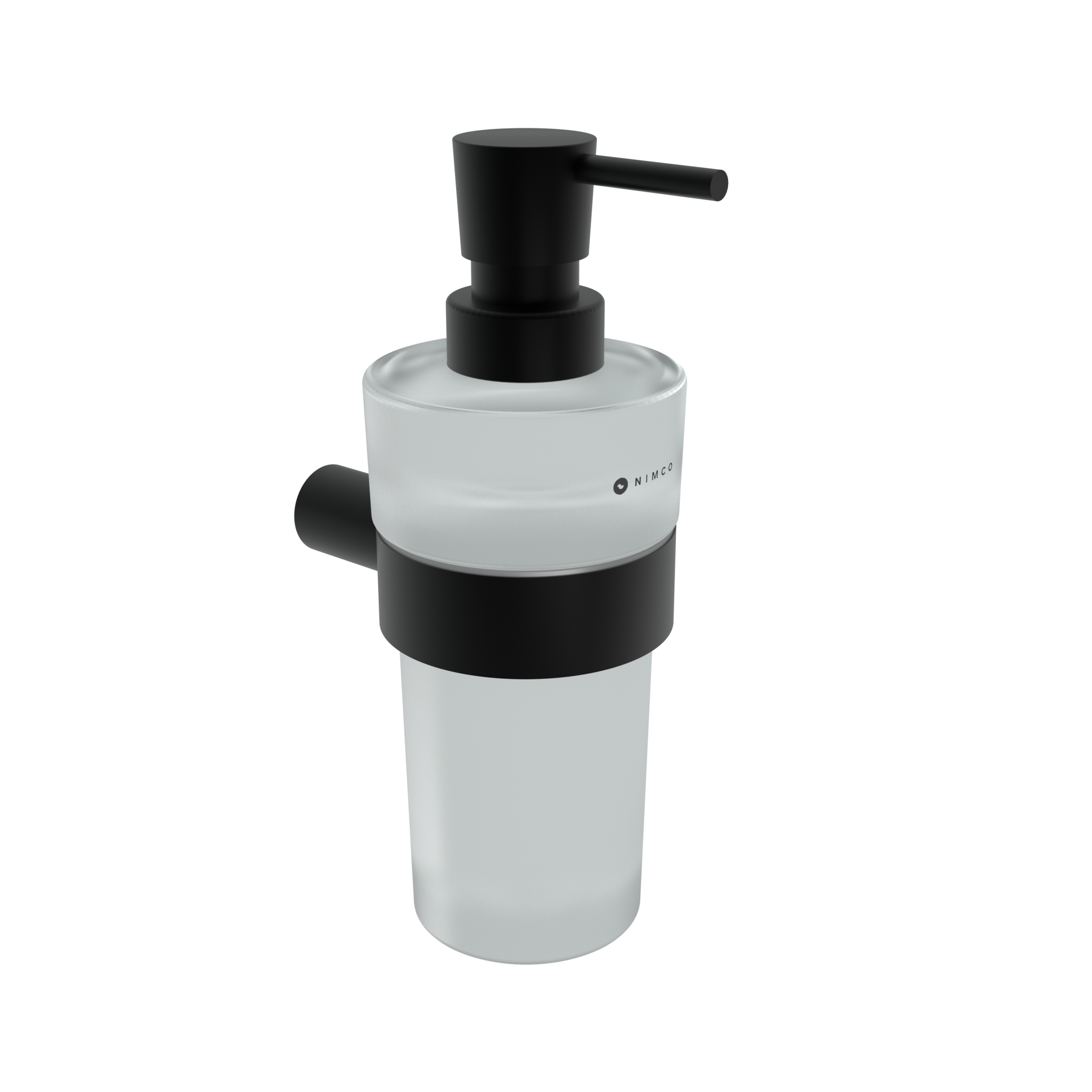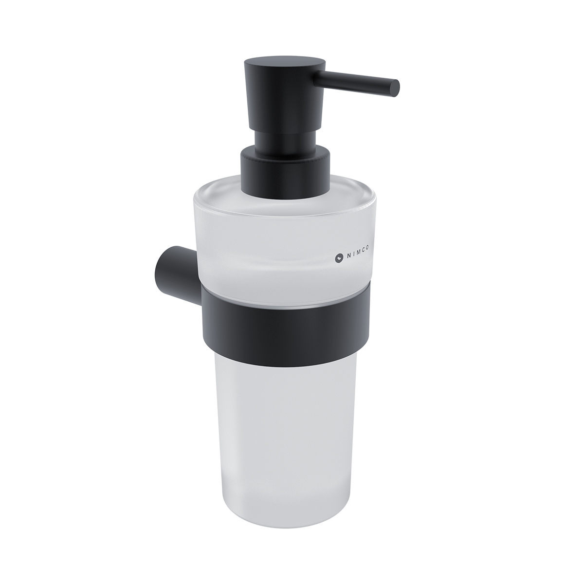 Black soap dispenser. Brass pump with chrome surface. Container made of satin glass. Volume 250 ml.