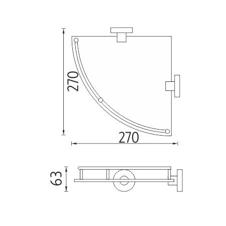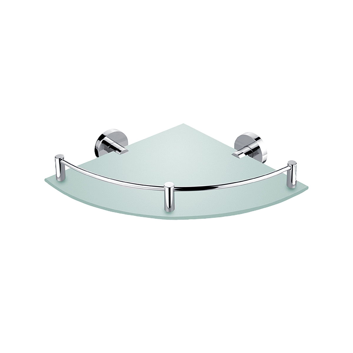 Corner shelf with rail. Satin glass. Radius 25 cm.