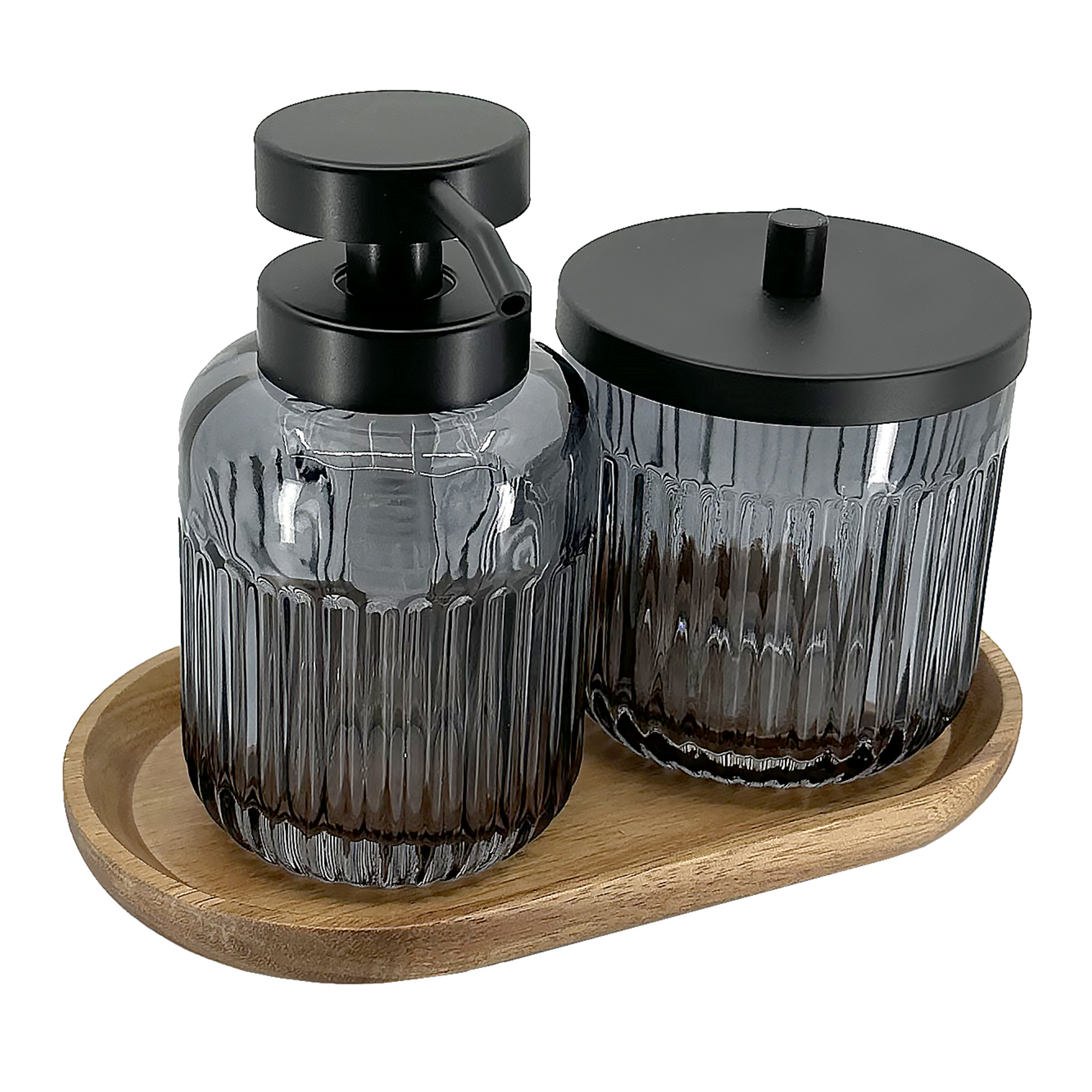 Container for cosmetic pads made of translucent black glass with a glossy finish.