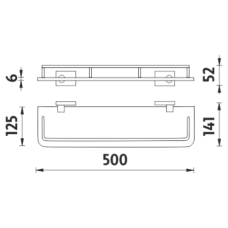 Shelf with rail made of satin glass. 50 cm long. Brass holders, chrome surface finish.