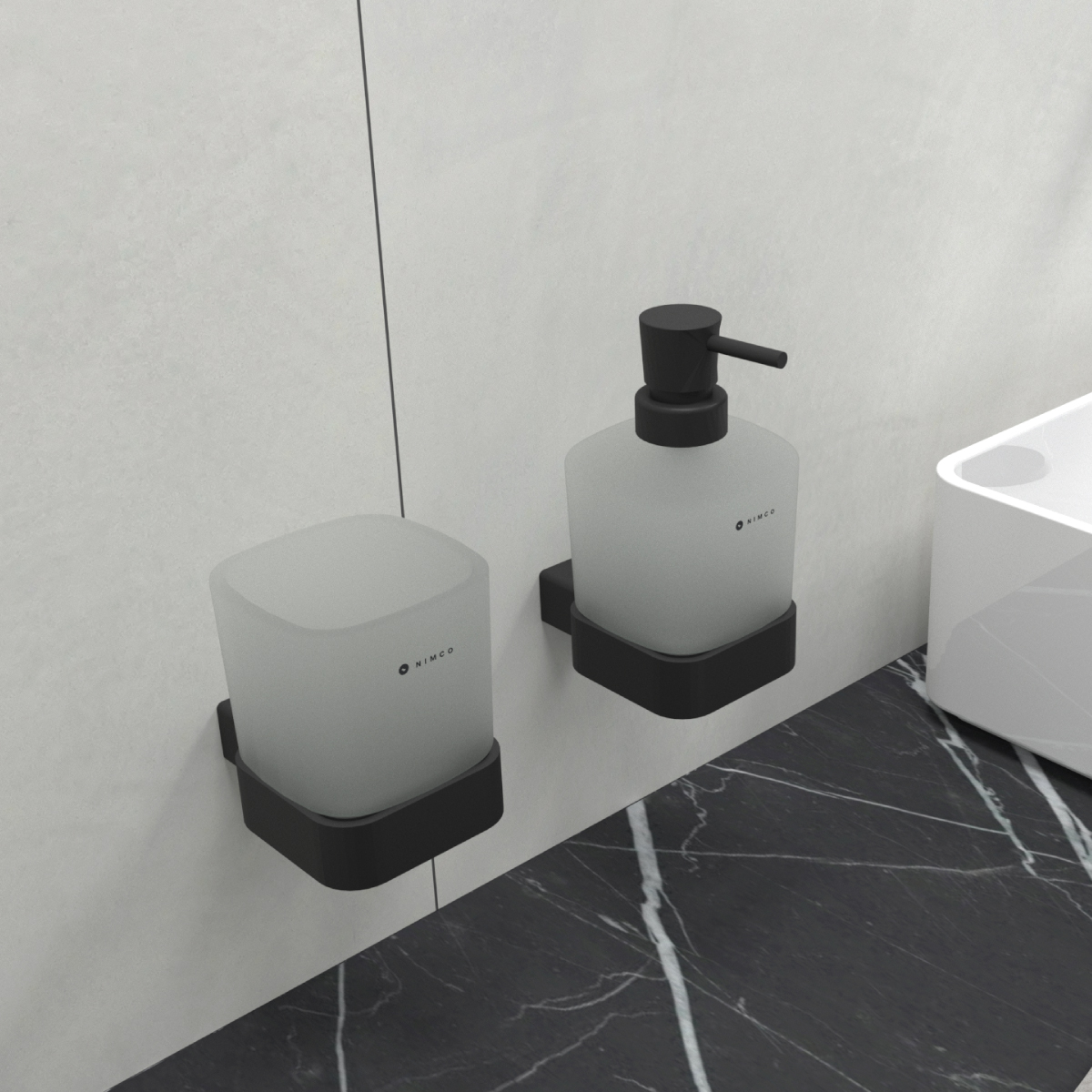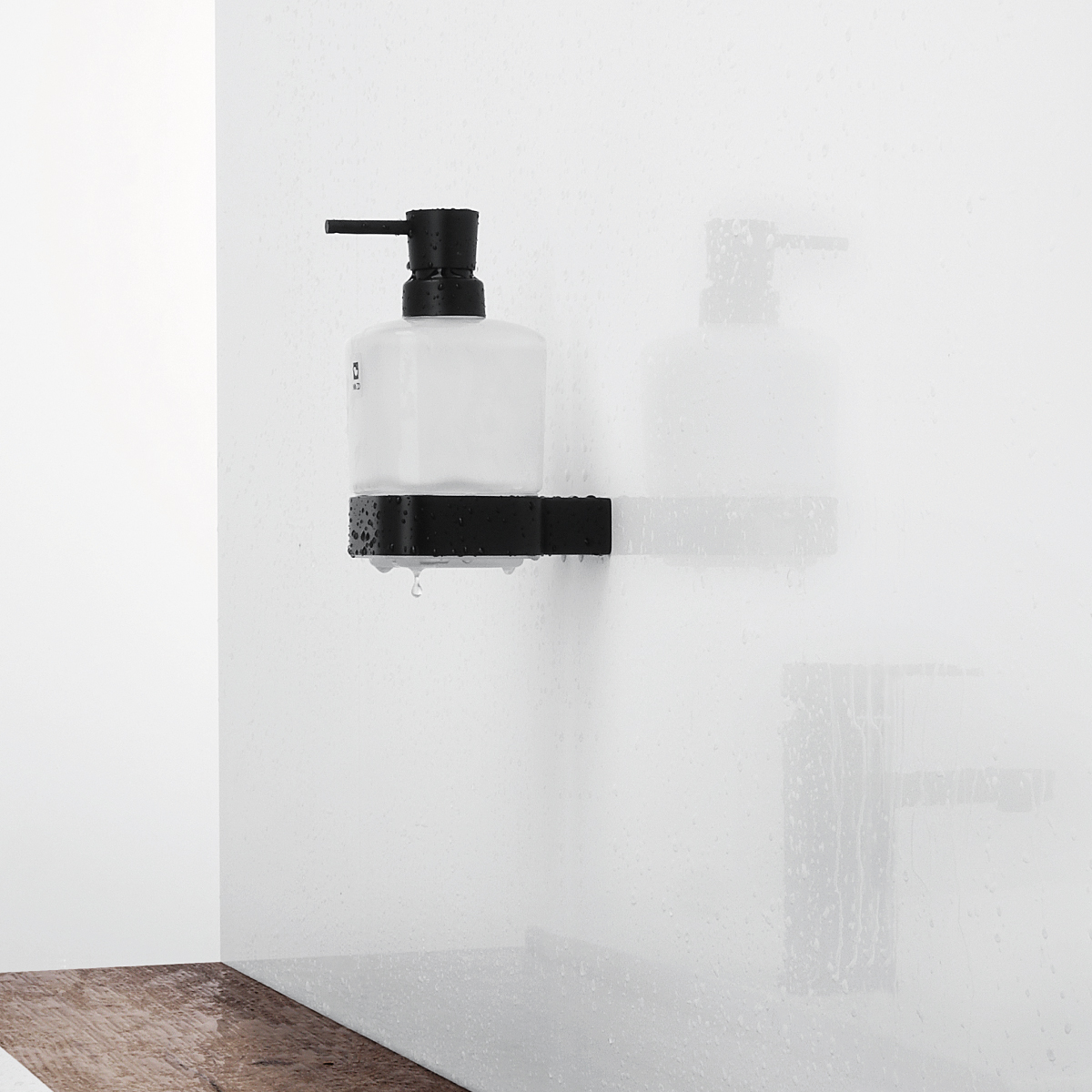 Soap dispenser. Container made of satin glass, 300 ml. Brass pump and holder / black matte.