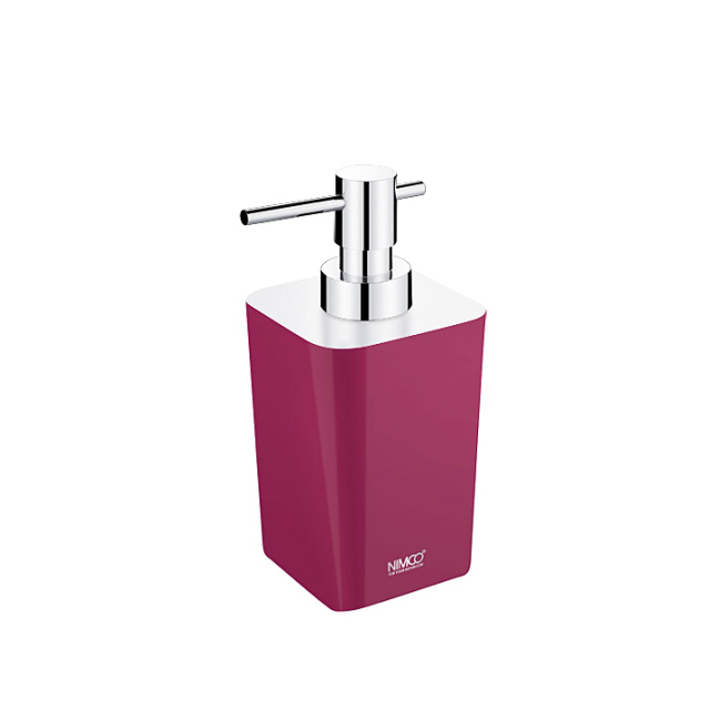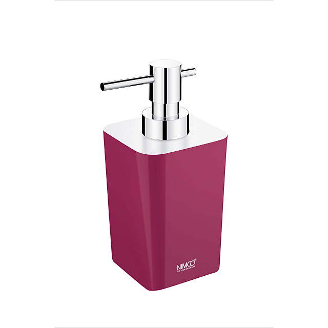 Free standing soap dispenser with chrome plated dispenser pump.