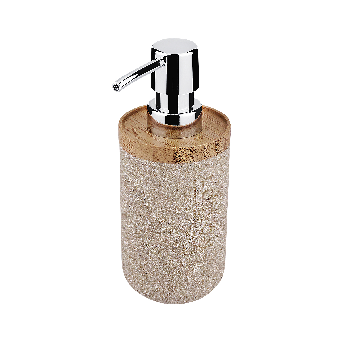 Soap dispenser. Sandy beige color. Made of polyresin, bamboo. Volume is 270 ml.
