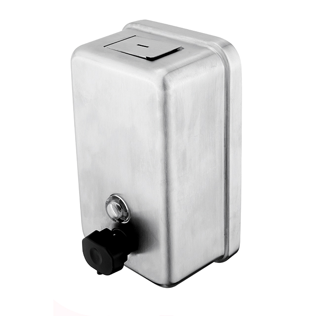 Soap or disinfectant gel dispenser - vertical. Brushed stainless steel 18/8. Volume 1100 ml. Plastic pump - black.