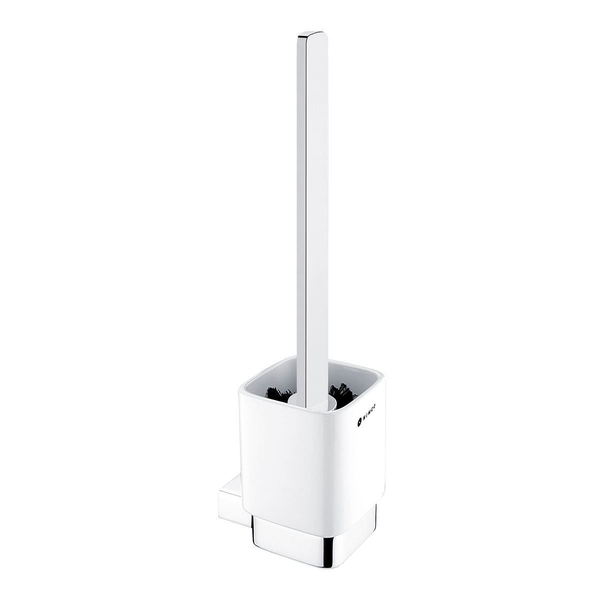 Toilet brush holder with ceramic container. Brass holder and handle, chrome surface finish.