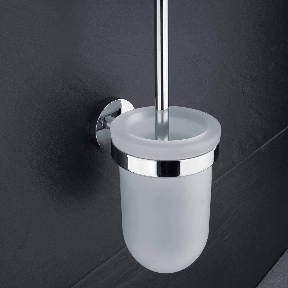 Toilet brush holder. Satin glass container, low. Handle made of brass/chrome.