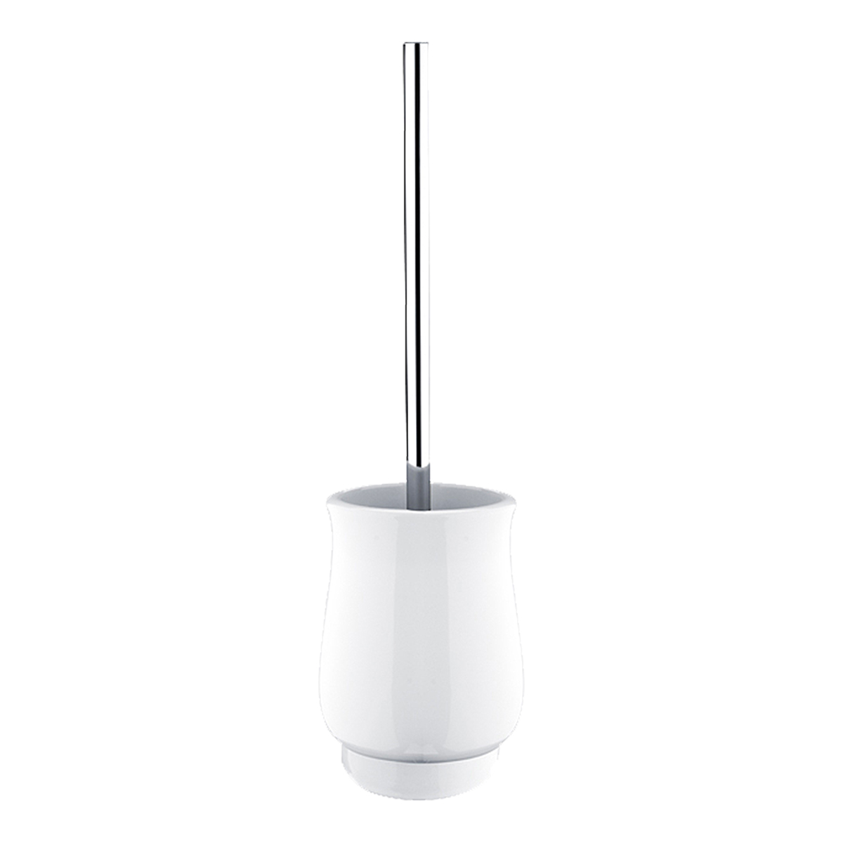 Ceramic free standing toilet brush holder. Metal handle with chrome surface finish.