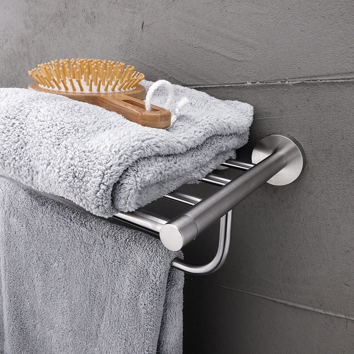 Towel shelf with grab bar for hanging towels. Brushed stainless steel.