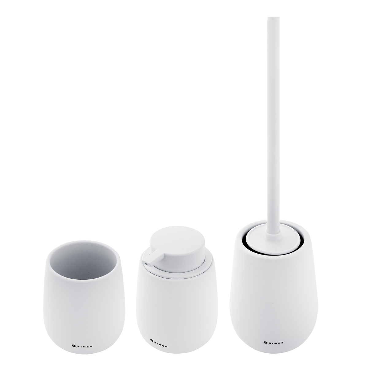 V sadě dávkovač tekutého mýdla, pohárek na kartáčky a WC kartáč. Nádobky keramické bílé matné. Objem dávkovače 425 ml. Pumpička plast. Rukojeť kartáče nerez ocel. Soft-touch povrch.
