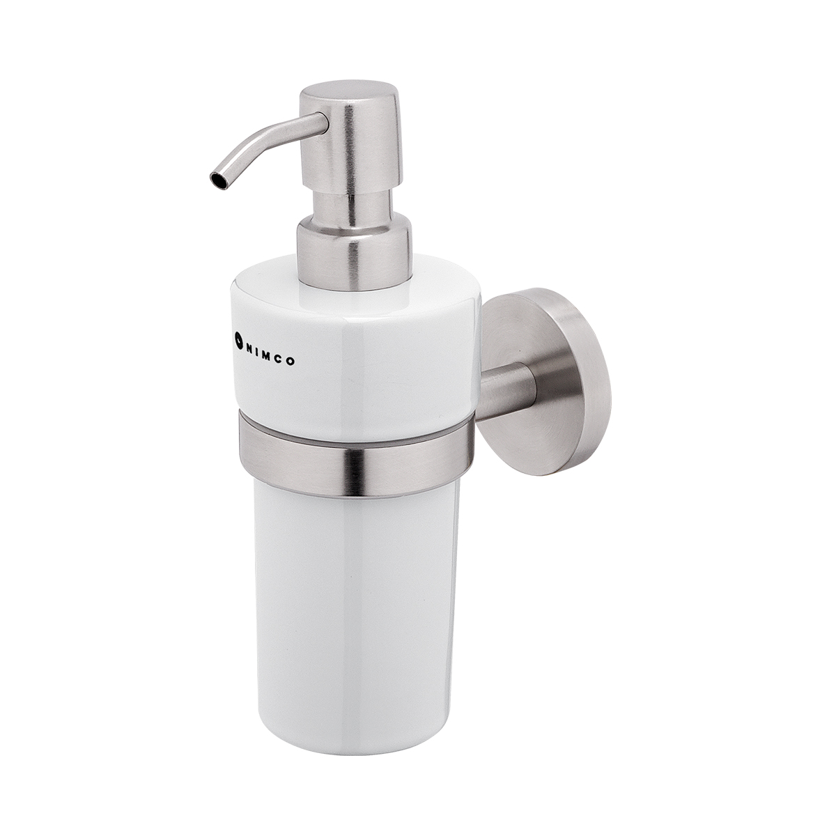 Nástěnný dávkovač tekutého mýdla. Úchyt i pumpička broušená nerez. Nádobka keramická, 300 ml.