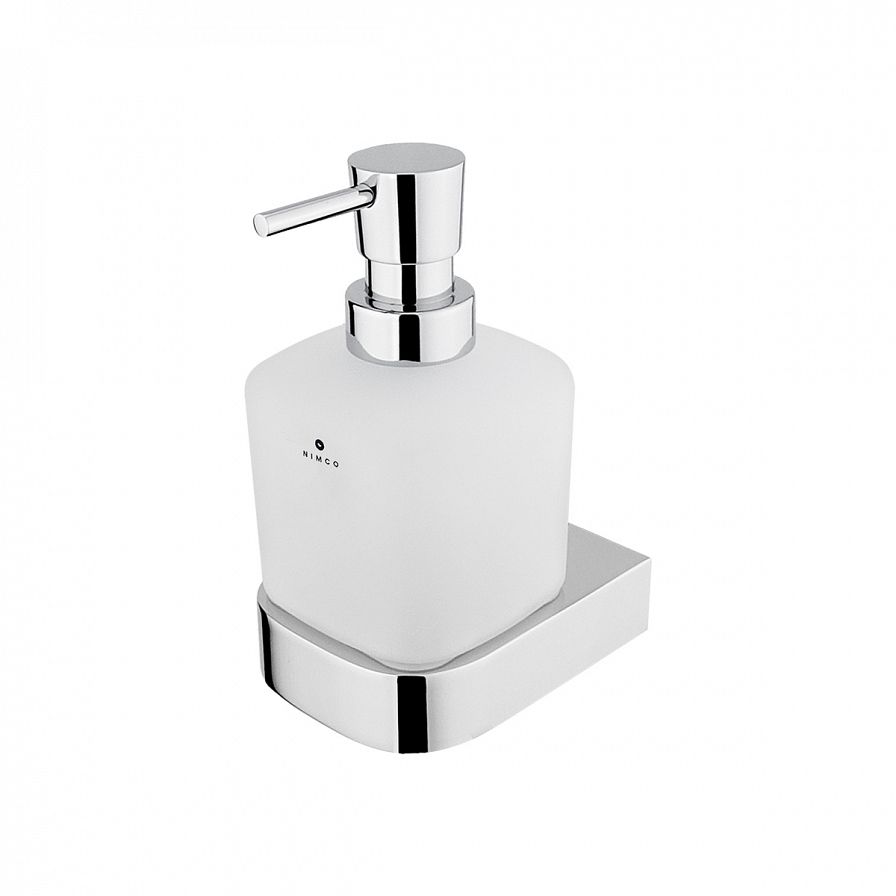 Nástěnný dávkovač na tekuté mýdlo o objemu 300 ml. Nádobka z matného skla. Pumpička plast/chrom.