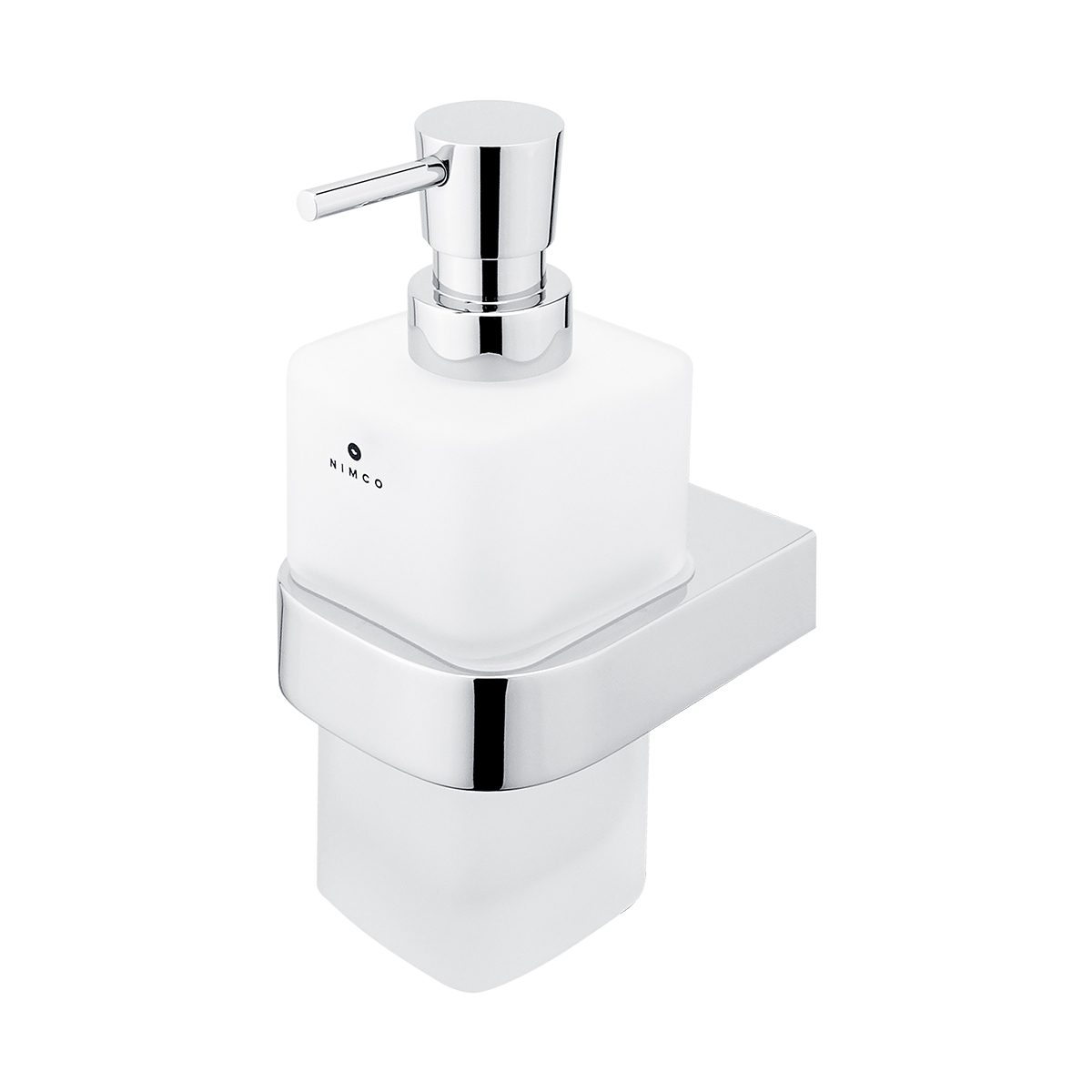 Nástěnný dávkovač na tekuté mýdlo o objemu 290 ml. Nádobka z matného skla. Pumpička plast/chrom.