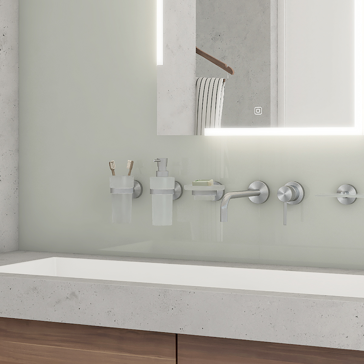 Nástěnný dávkovač tekutého mýdla. Úchyt i pumpička broušená nerez. Nádobka z matného skla, 250 ml.