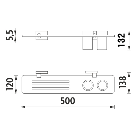 Police plexiglass s frézovanými otvory s mat. sklenkami. Úchyty mosaz / chrom. Délka 50 cm.