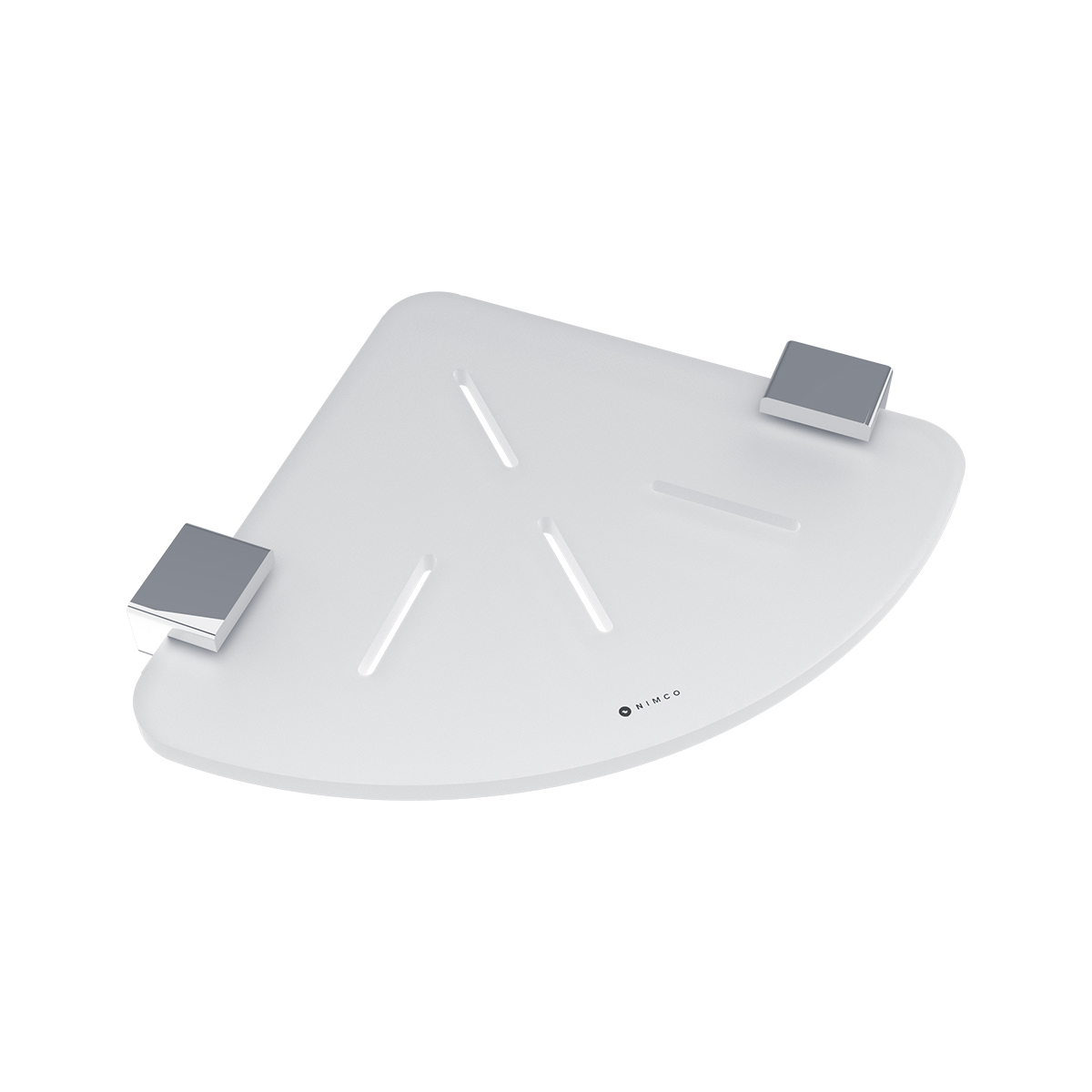 Rohová police plexiglass s frézovanými otvory. Úchyty mosaz-chrom.
