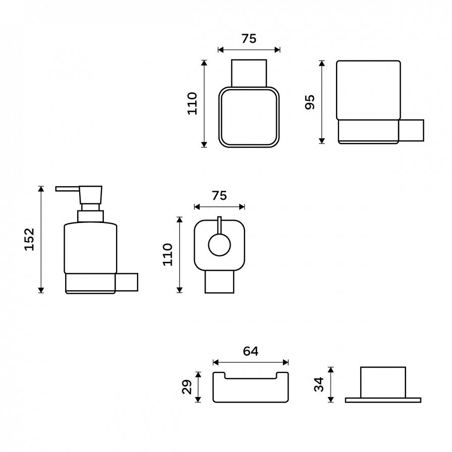 Sada koupelnových doplňků k umyvadlu. Nástěnný dávkovač tekutého mýdla, držák zubních kartáčků a háček na zavěšení ručníku ze série koupelnových doplňků Nimco Kibo černé.