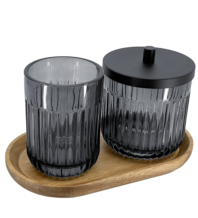 Série TIMO představuje harmonii elegance a funkčnosti. Volně stojící doplňky z černého skla s jemným vroubkováním působí jako malé designové šperky pro každou koupelnu. Jejich struktura zachycuje světlo a stín, čímž vytváří jedinečnou hru odlesků, která dodává prostoru hloubku a noblesu.