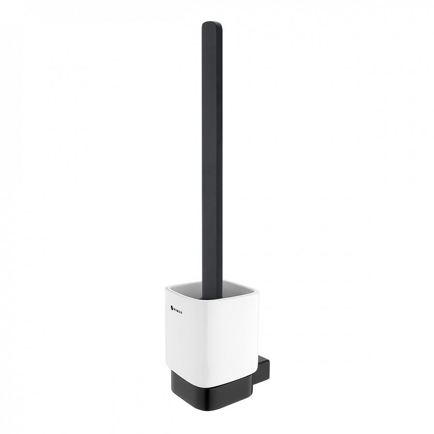 WC štětka s masivní hranatou rukojetí z mosazi, s keramickou nádobkou. Úchyt z mosazi, povrchová úprava černý mat.