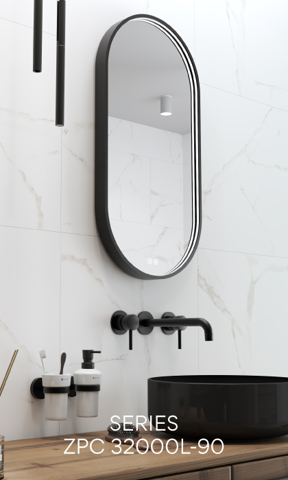 The LED mirror with white frame brings a combination of functionality and aesthetics to your bathroom.