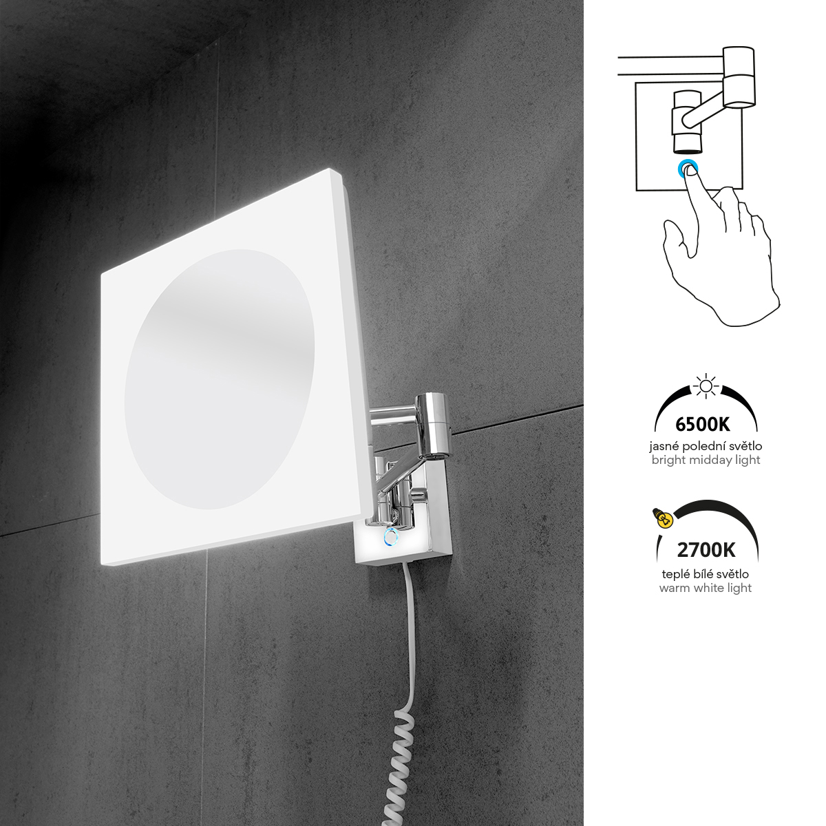LED zvětšovací zrcátko s dotykovým podsvíceným senzorem s nast.teplotou chromatičnosti 6500 / 2700 K. Zvětšení 5x.
