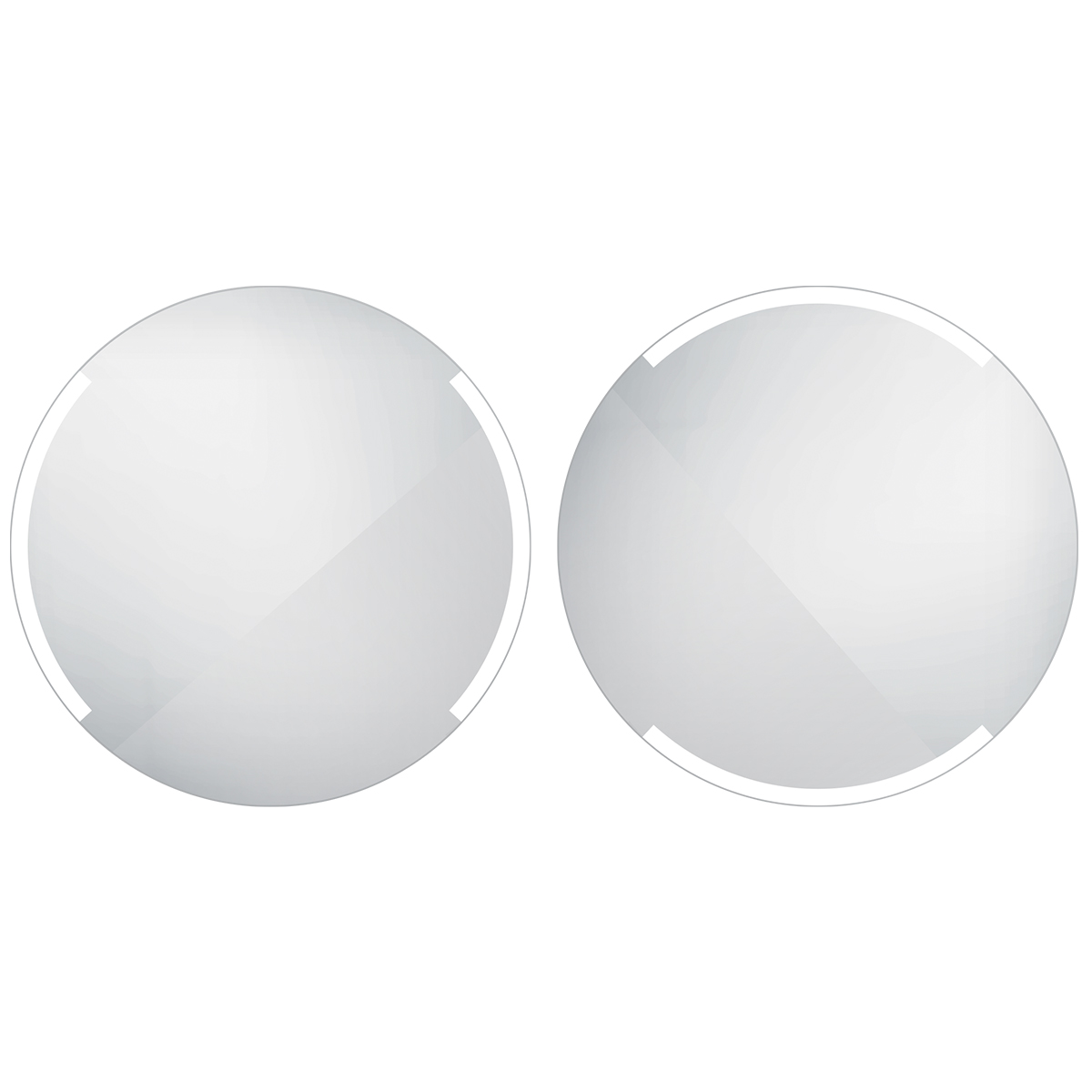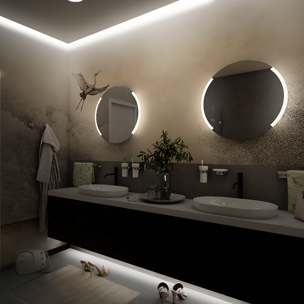 Kulaté bezrámové zrcadlo a s podsvícením ze stran pro moderní a elegantní vzhled.