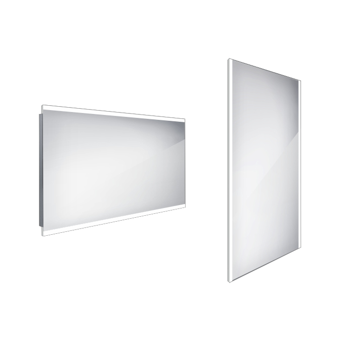 Obdélníkové bezrámové zrcadlo s ostrými rohy a podsvícením ze spodu a shora pro rovnoměrné a stylové osvětlení.
