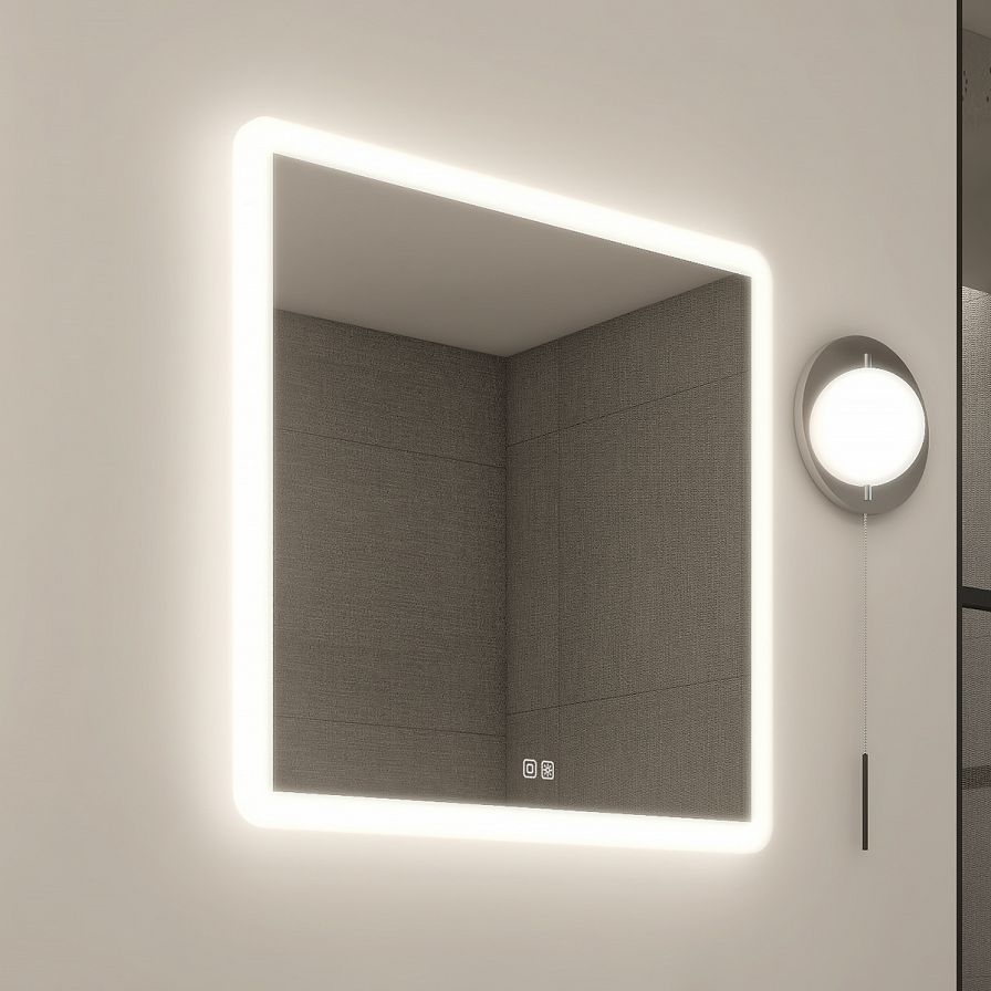Čtvercové bezrámové zrcadlo s oblými rohy a celoobvodovým podsvícením pro dokonalé a rovnoměrné osvětlení.