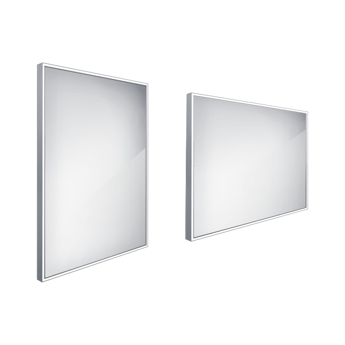 Obdélníkové zrcadlo s rámem s ostrými rohy a celoobvodovým svícením pro dokonalé a rovnoměrné osvětlení.