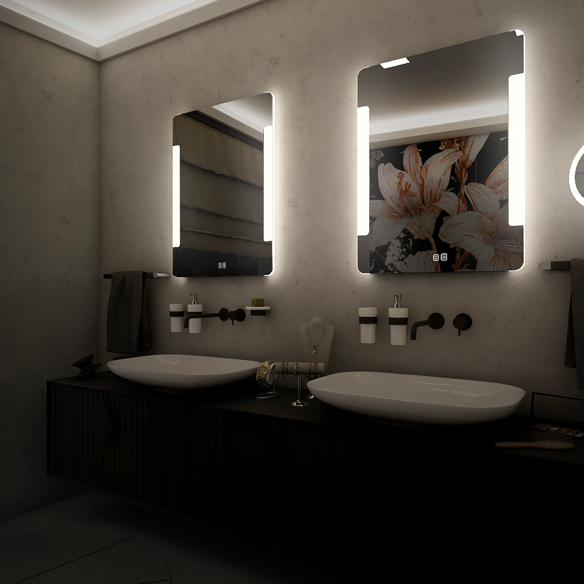 Obdélníkové bezrámové zrcadlo s oblými rohy a podsvícením ze stran pro moderní a elegantní vzhled.