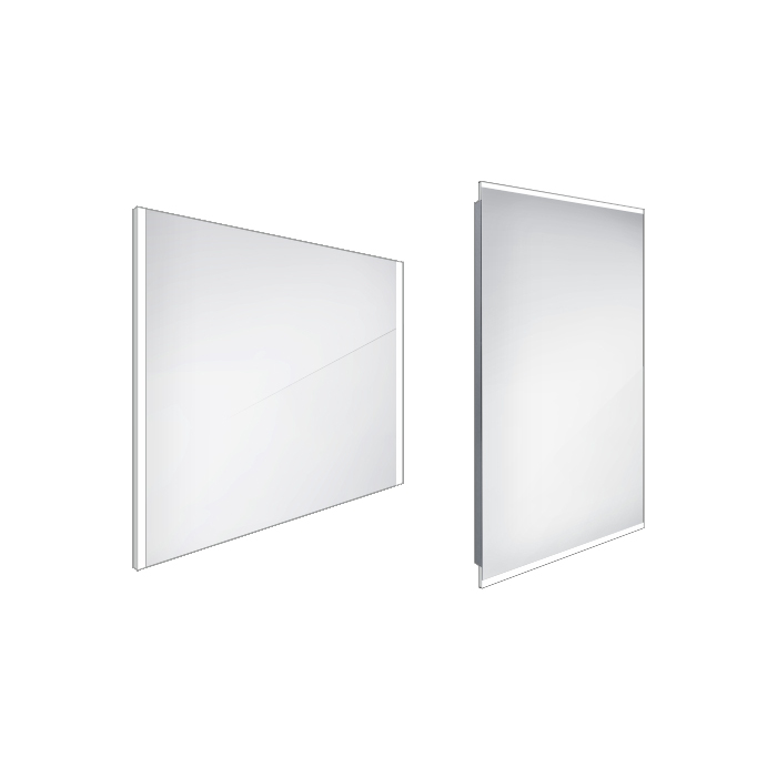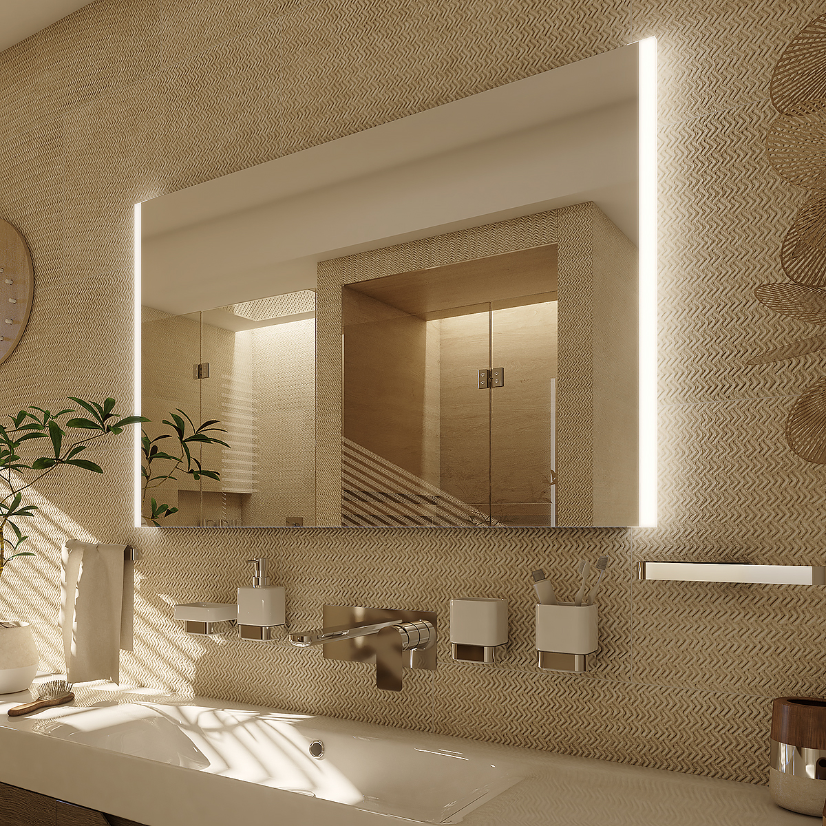 Obdélníkové bezrámové zrcadlo s ostrými rohy a podsvícením ze stran pro moderní a elegantní vzhled.