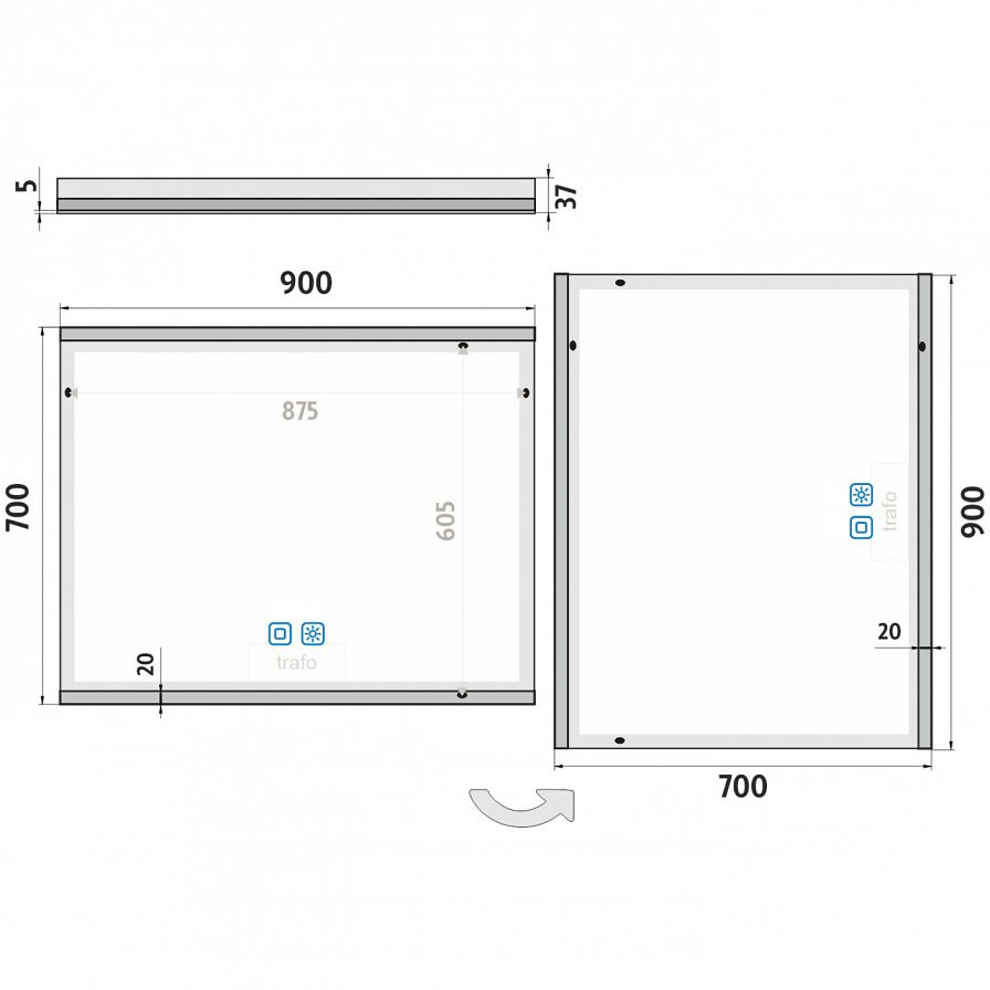 Ovládání: Dotykové senzory + možnost ovládání nástěnným vypínačem Nastavení barvy podsvícení: Ano Barva podsvícení: Nastavitelná v rozsahu 3000–6500 K (od teplé po studenou bílou) Funkce stmívání: Plynulé stmívání Paměť nastavení: Ano Konstrukce podsvícení: K rovnoměrnému rozptylu světla zrcadlo disponuje difuzorem z akrylového skla Integrace LED: LED diody jsou integrovány přímo v difuzoru LED čip: Nejmodernější LED čipy SMD 2835 LED pásek - hustota čipů: 192/m (96+96/m) Životnost LED čipů: Až 50 000 hodin Kvalita osvětlení LED: Survival Factor = 1; Lumen maintenance factor = 0,99; Flicker metric = 0,02 Materiál: Zrcadlové sklo, hliník Materiál konstrukce: Rám zrcadla a kryt zdroje jsou vyrobeny z hliníku Tloušťka skla: 5 mm Ochrana při rozbití: Bezpečnostní fólie Stupeň ochrany: IP 44 Certifikace: Český certifikát CE Umístění: Montáž na stěnu Možnost upevnění vertikálně i horizontálně Montážní příslušenství: Součástí balení je montážní sada a kabelová spojka s ochranou IP 44 Obal: Zabalené pro přepravu kurýrní službou Napětí: Vstupní napětí 220-240 V Výstupní napětí 12 V Příkon: 26 W, světelný tok: 1872 lm Rozměr: v: 700 mm š: 37 mm d: 900 mm Hmotnost: 11,4 kg M A T E R I Á L & F U N K Č N Í P A R A M E T R Y